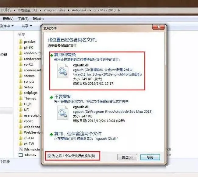 14.将刚刚复制的破解文件粘贴到3dsmax2013的安装目录里,替换原先的文件。