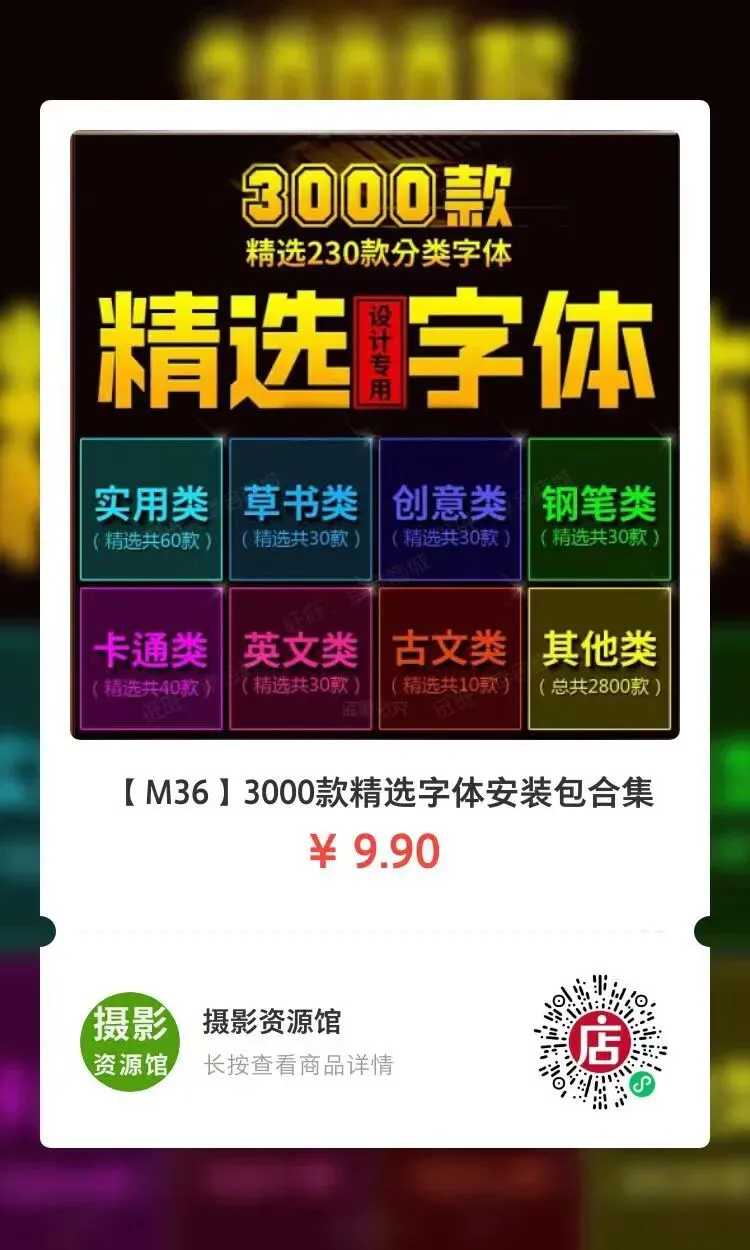 [M36]3000款精选字体安装包合集限时免费领取方法扫码关注长按二维码回复:S1378长按二维码回复:S1378长按二维码回复:S1378VIP会员网站搜索S1378VIP网站:www.sheyingzyg.com领取邀请码加入VIP,获得全站资源微店可立即获取- END -免责声明本公众号资源均通过网络等合法渠道获取,该资料仅作为学习交流,其版权归出版社或者原作者所有,本公众号不对所涉及的版权问题负责。如有侵权,请来信通知,并提供相关证实资料,如若情况属实,我们会撤下相关文章。点击“阅读原文”进微店购买,自动秒发货