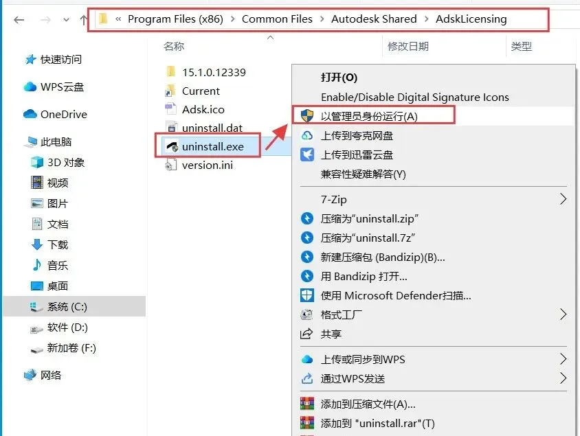可以复制此路径【C:\Program Files (x86)\Common Files\Autodesk Shared\AdskLicensing】粘贴到我的电脑上方的地址栏然后按回车键打开,选中下图所示文件,鼠标右键选择【以管理员身份运行】,运行完后可以重新打开安装程序进行安装。