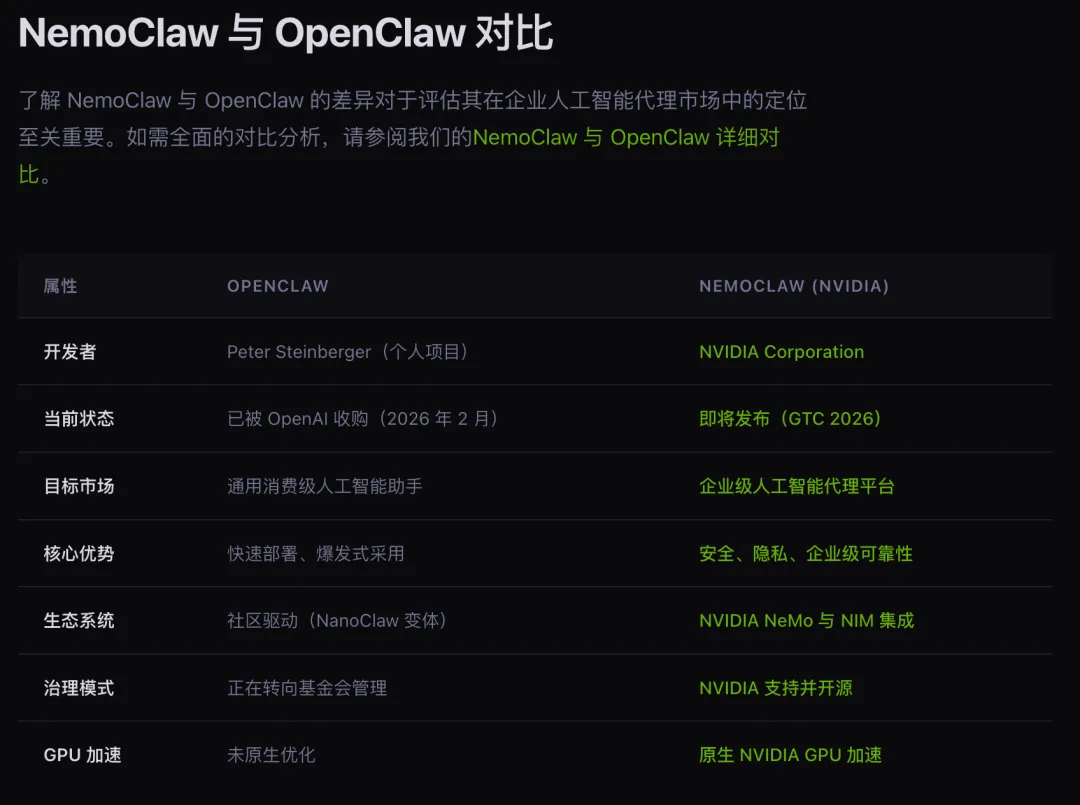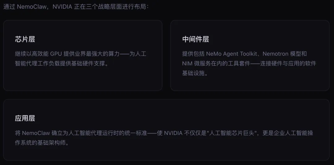 但现实却给了一记响亮的耳光:CTO 狂喜:因为 OpenClaw 的功能确实强大;CEO 担忧:担心 OpenClaw 的一个抽风就把公司的机密数据外泄了这就是个现实的问题:在没有安全保障的情况下,你敢把公司的核心业务交给一个随时可能暴走的 AI 去自动执行吗?答案是否定的。这也是英伟达在 GTC 大会上重磅推出 NemoClaw 的原因。NemoClaw 不是为了取代 OpenClaw,而是要将 OpenClaw 从一个不可控的风险源,变成一个真正能在企业里 安分守己 干活的员工。01 OpenClaw 的致命缺陷要理解 NemoClaw 的厉害之处,我们必须先弄清楚 OpenClaw 到底哪里出了问题(强烈推荐看一下 PP 写的这篇 OpenClaw:不完美,才暴利。)OpenClaw 的设计初衷是让 AI 具备规划、推理和执行的完整闭环能力。为了防止 AI 乱来,OpenClaw 之父 Peter 确实也做了一些安全防护。但这些防护存在一个致命缺陷:它们全部被放在了“软件层”,而不是更底层的“系统层”。好比在一个放满金条的房间里装了 100 个摄像头,贴满了"禁止入内"的警告标语,但却唯独忘了给房间的大门装上一把结实的锁。只要小偷足够聪明,他就能轻而易举地把金条搬空。在 OpenClaw 的世界里,安全防护主要依赖两种机制: