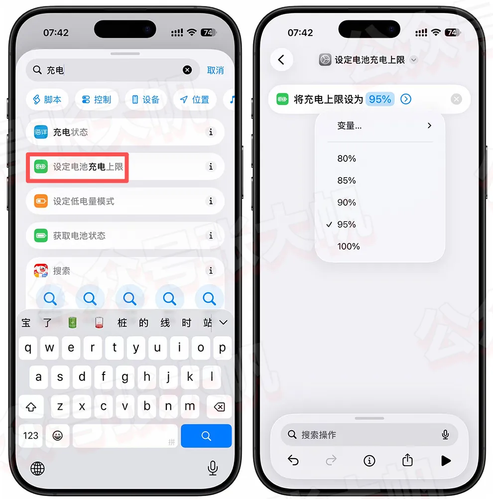 新增充电上限的快捷指令,我们可以打开快捷指令>创建快捷指令>搜索充电,就能看到选择,点击就能设置百分比,根据自己的需求来自动调整充电上限 。