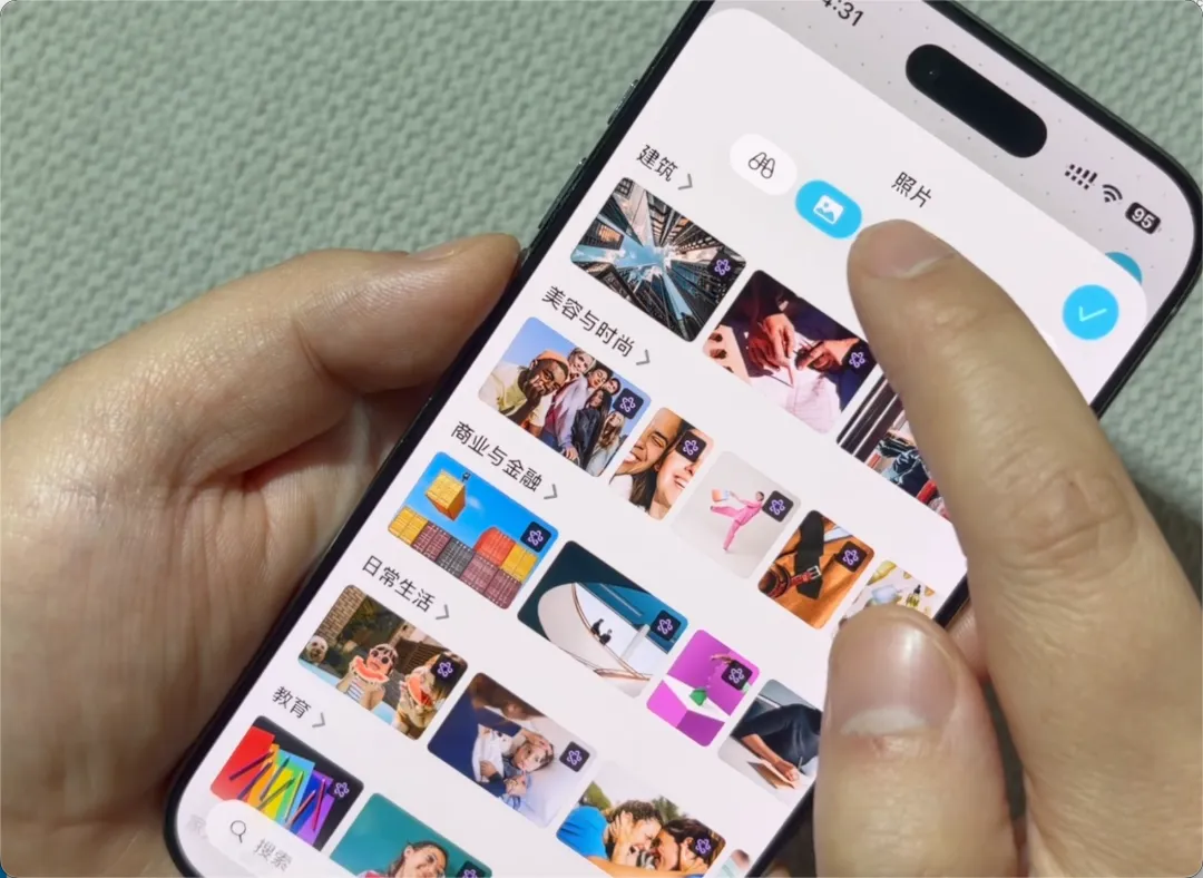 进入形状后,之前操作为左右滑动,现在改为上下滑动,除了几何图形,还新增了探索、照片、图形和背景素材,这些素材中部分则需要付费才能使用。