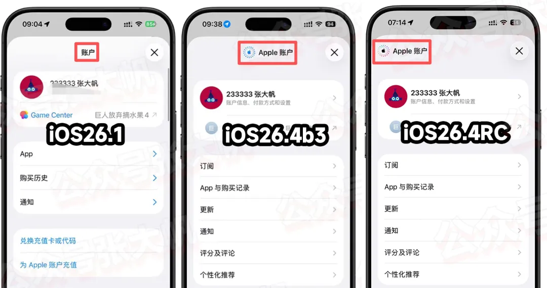 Apple账户界面大改版, 将APP更新等全部放到2级界面,顶部的账户改为Apple账户,字体由据中对齐改为向左对齐,改版后,整个界面更直观。