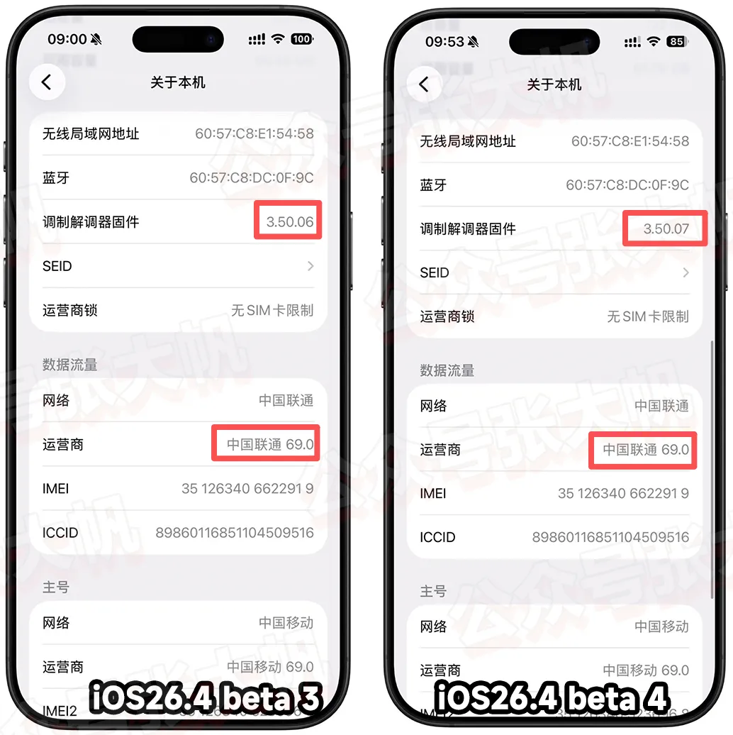 13 调制解调器与运营商版 升级后,调制解调器从 3.50.06 变成了 3.50.07 运营商升级69 9.0!