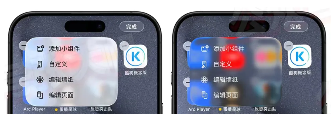 14 优化菜单液态效果 长按主屏幕空白处选择编辑,编辑菜单使用了更加透明的液态玻璃效果,更美观了。