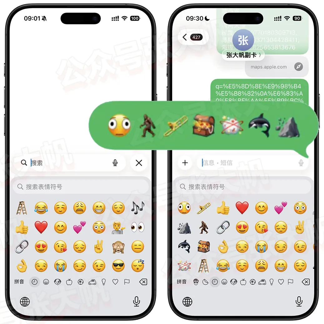 15 全新的emoji表情 升级后,新加入了扭曲脸、大脚怪、长号、宝藏箱等8个有趣的表情包,其中扭曲脸感觉还不错,升级的朋友可以打出来发在留言区,低系统的设备无法显示。