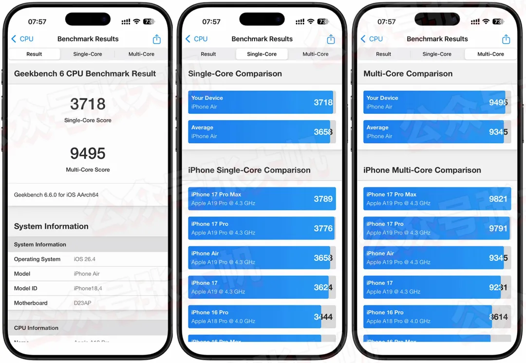 17 GeekBench 6 跑分 由于我最近换了新机,之前拿 iPhone15 Pro 的数据已作废,现在只能通过iPhone Air 简单跑个分,大家可以参考一下。