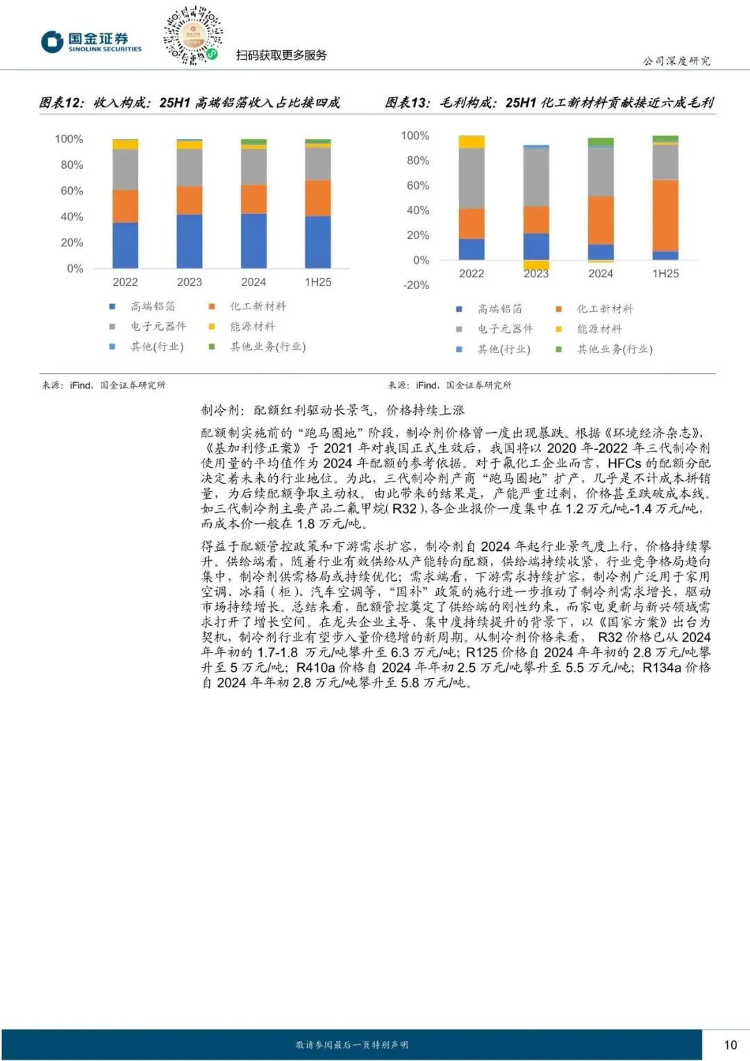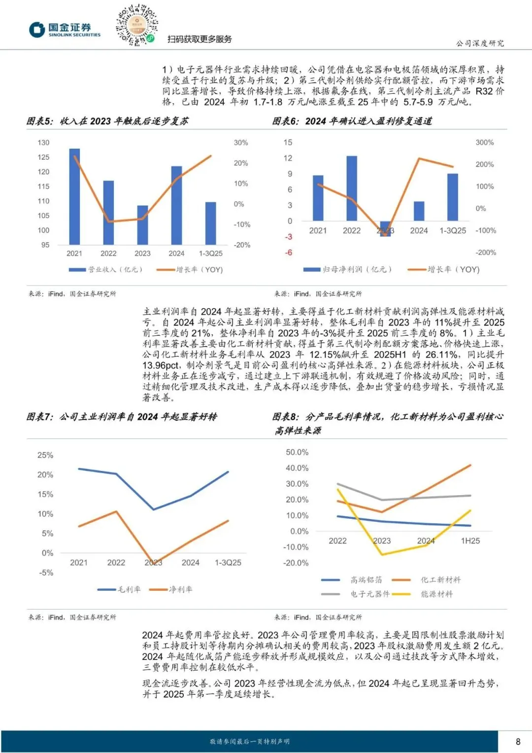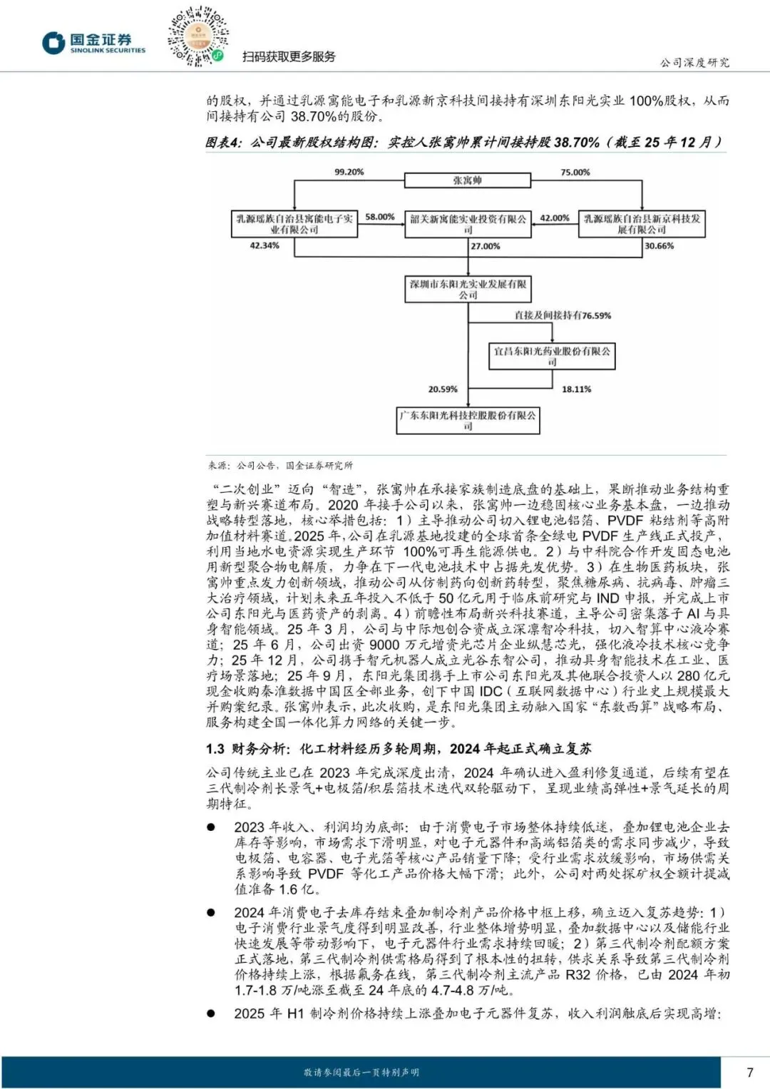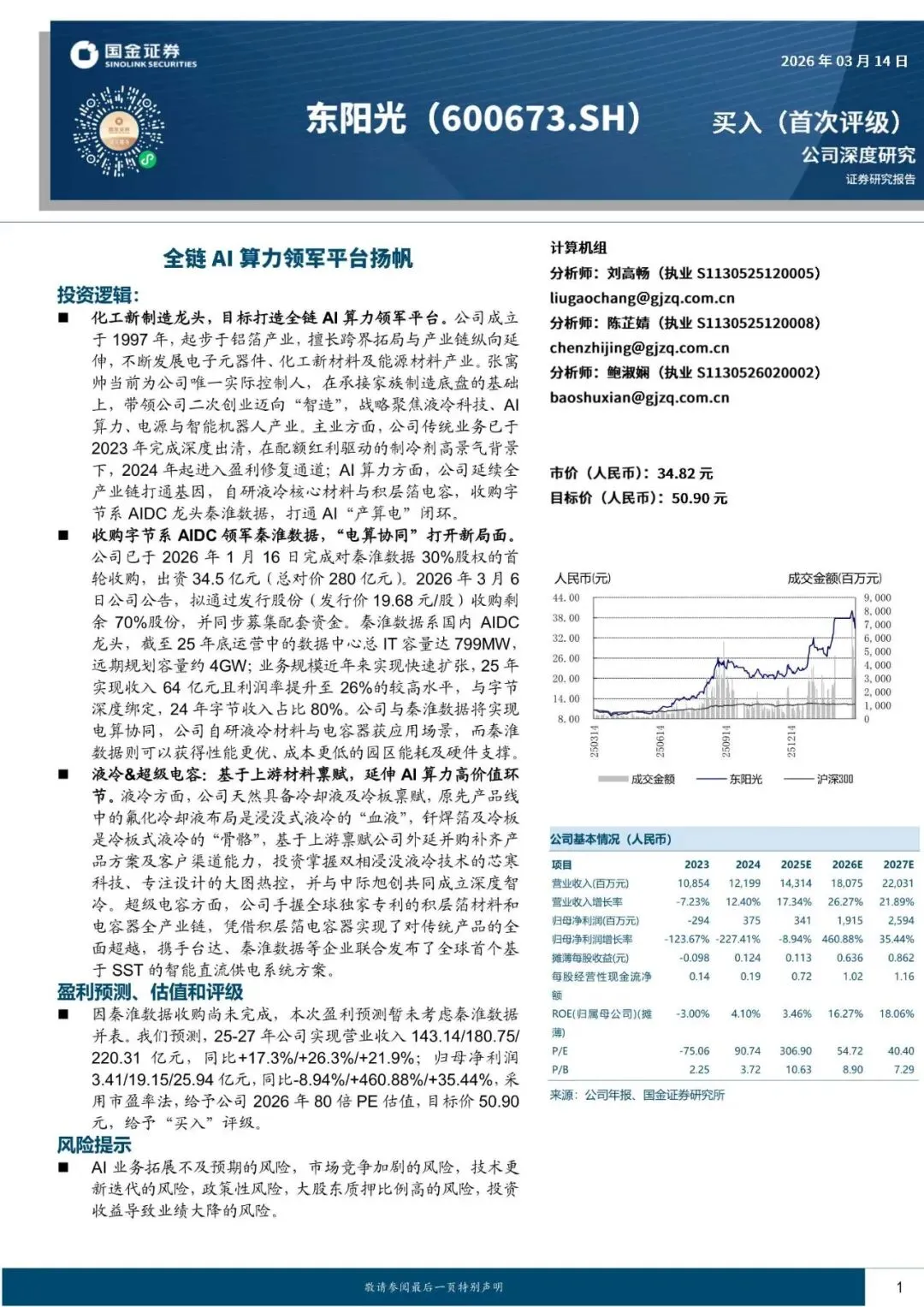 主业方面,公司传统业务已于2023 年完成深度出清,在配额红利驱动的制冷剂高景气背景下,2024 年起进入盈利修复通道;AI 算力方面,公司延续全产业链打通基因,自研液冷核心材料与积层箔电容,收购字节系 AIDC 龙头秦淮数据,打通 AI“产算电”闭环。