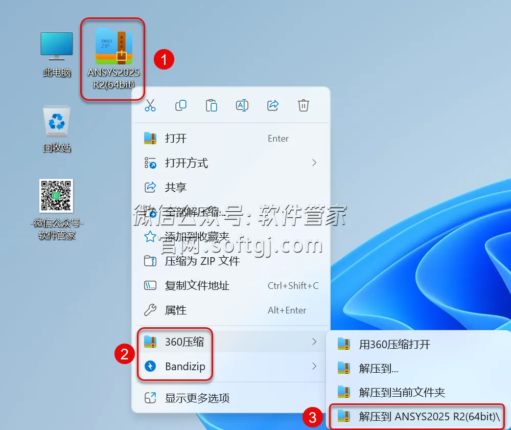 1.解压安装包:①鼠标右击【ANSYS2025 R2(64bit)】压缩包②选择电脑上安装的解压软件(如:360压缩)③点击【解压到ANSYS2025 R2(64bit)】。