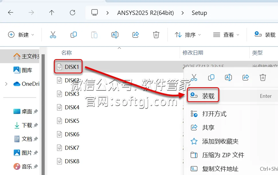 26.打开安装包解压后的【ANSYS2025 R2(64bit)】文件夹中【Setup】文件夹,鼠标右击【DISK1】选择【装载】。