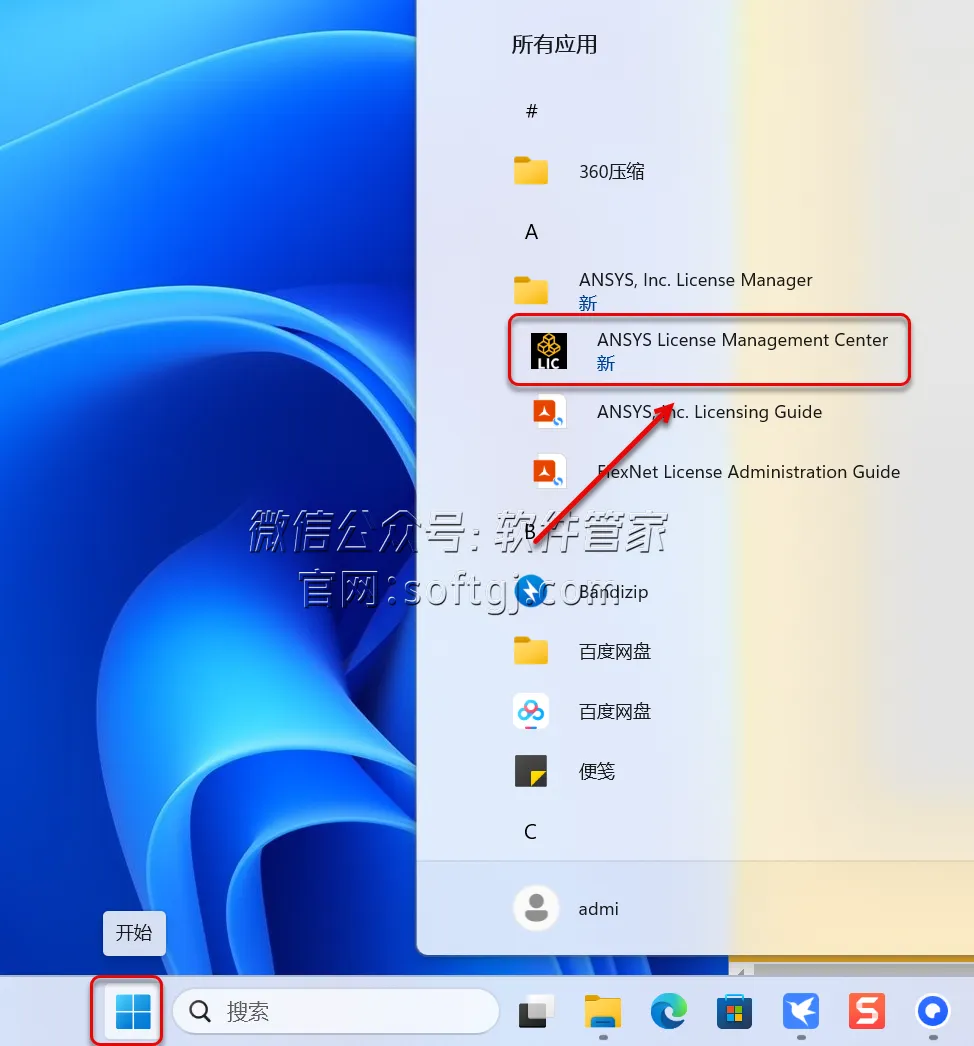 17.点击桌面任务栏中的【开始图标】>点击【所有应用】>双击展开【ANSYS,Inc……】文件夹,点击【ANSYS License Manager Center】。