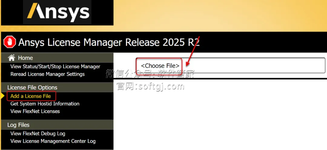 22.回到步骤18所在页面,点击【Add a License File】,点击【Choose File】。