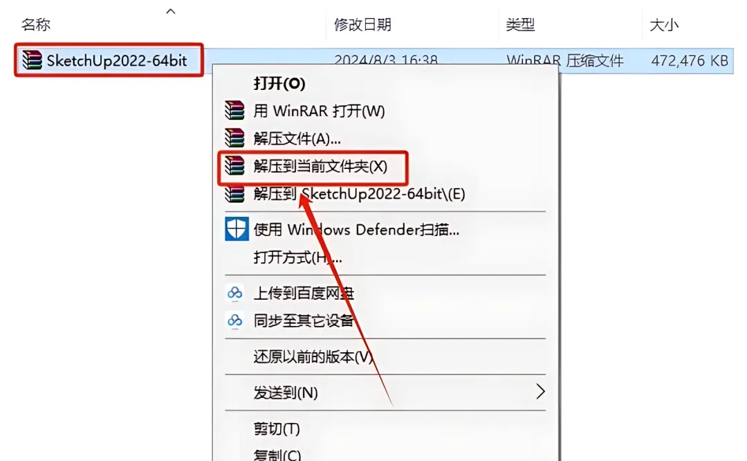 1.打开下载好的SketchUp安装包,鼠标右击压缩包选择【解压到当前文件夹】。