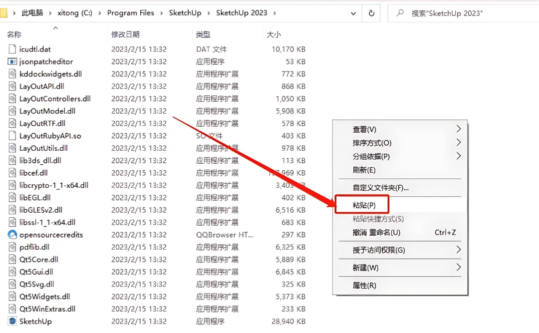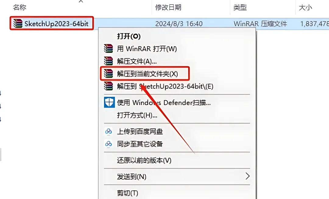 1.打开下载好的SketchUp 2023安装包,鼠标右击压缩包选择【解压到当前文件夹】。