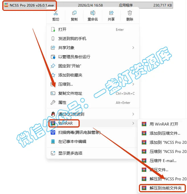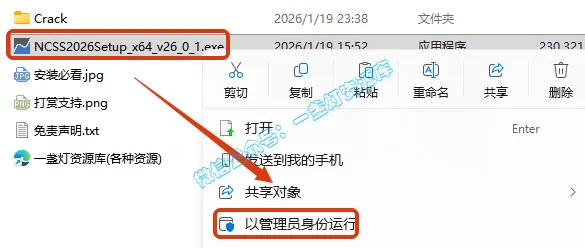 2.打开刚刚解压的文件夹,鼠标右键点击【NCSS2026Setup_x64_v26_0_1.exe】选择【以管理员身份运行】