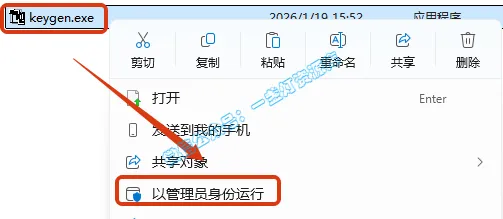 11.返回之前解压的文件夹,双击打开【Crack】文件夹,选中【Keygen.exe】文件,鼠标右键点击【以管理员身份运行】
