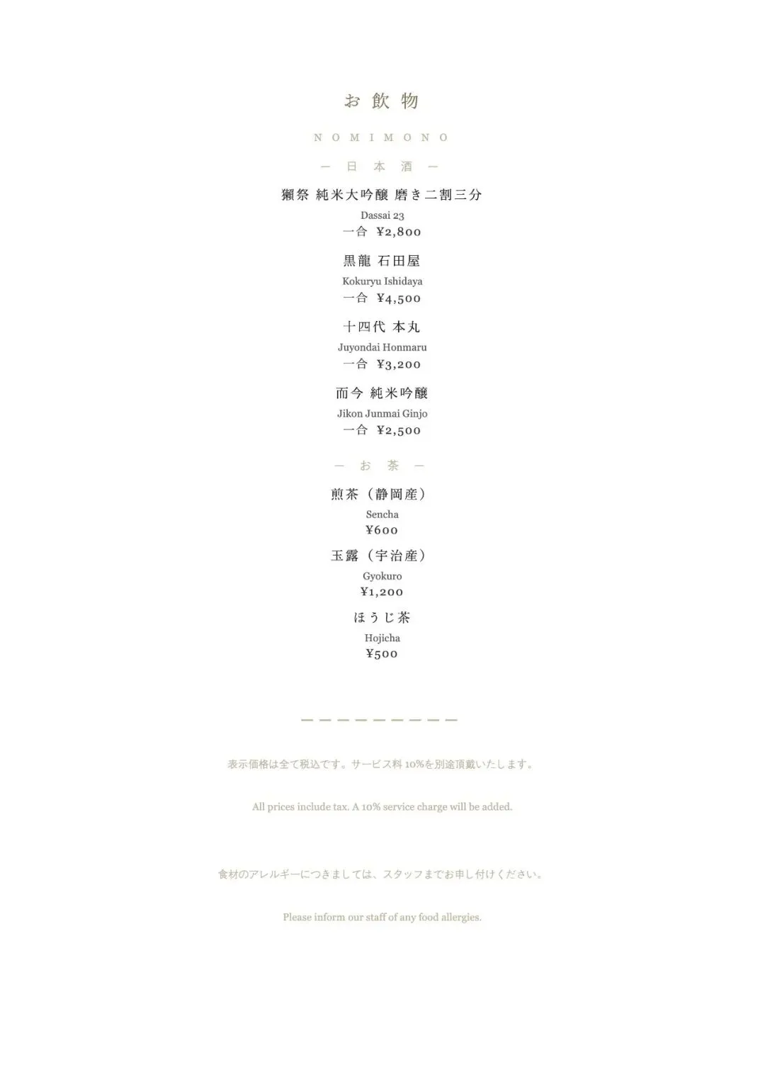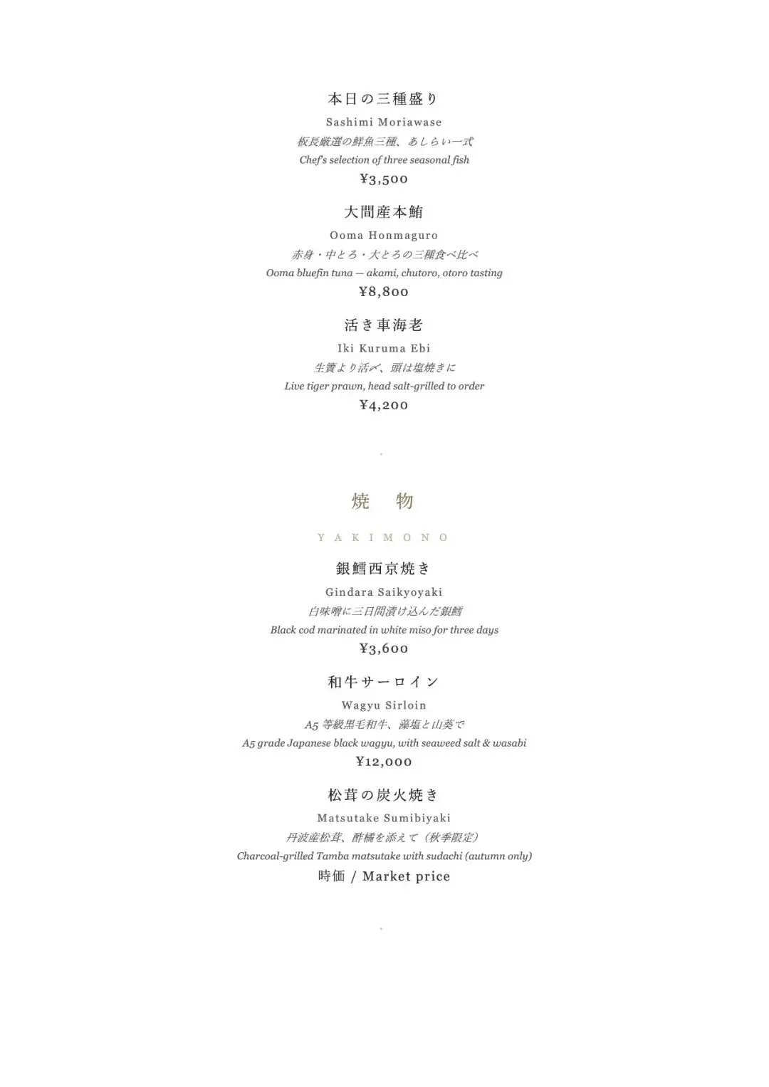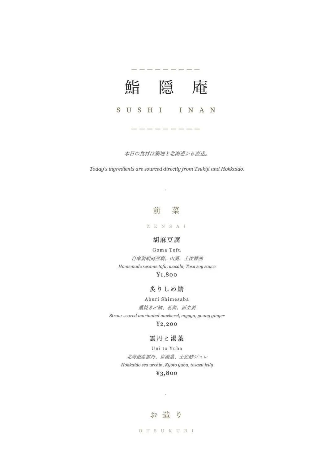 Query:为高端 Omakase 日料餐厅体验打造一份精致、高端的菜单,呈现奢华、优雅的质感,具备餐厅级专业水准,布局简洁、措辞考究。需包含以下板块:时令刺身、寿司、烤物、前菜、主厨招牌套餐、甜品及饮品。