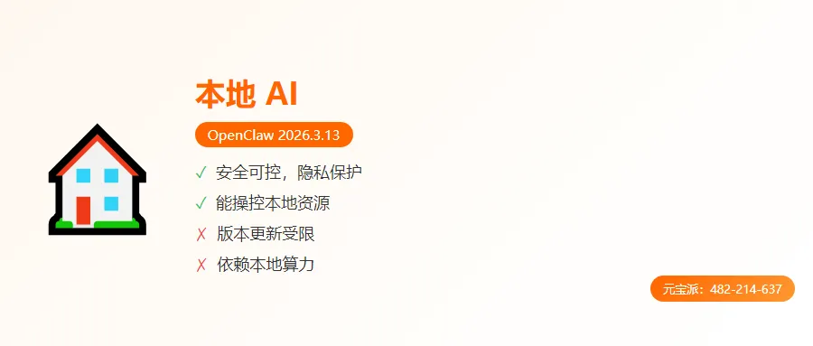 本地部署的 AI,如 QClaw(OpenClaw 2026.3.13),安全可控,能直接操控本地资源,但版本受限于定制化;云端 AI,如 元宝(最新版本),连接广阔世界,版本迭代自由,却依赖网络而居。