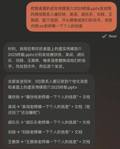 生成之后,它会先把内容发给我确认,确认完才会操控微信,发出去。