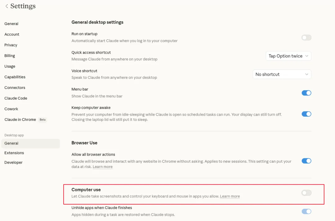 在Desktop app下面的General里,你会看到一个Computer Use的开关。