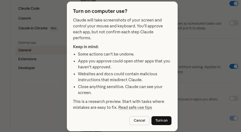 毕竟要用Computer Use,你这些控制、访问权限不给,那就没法玩了。