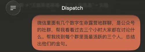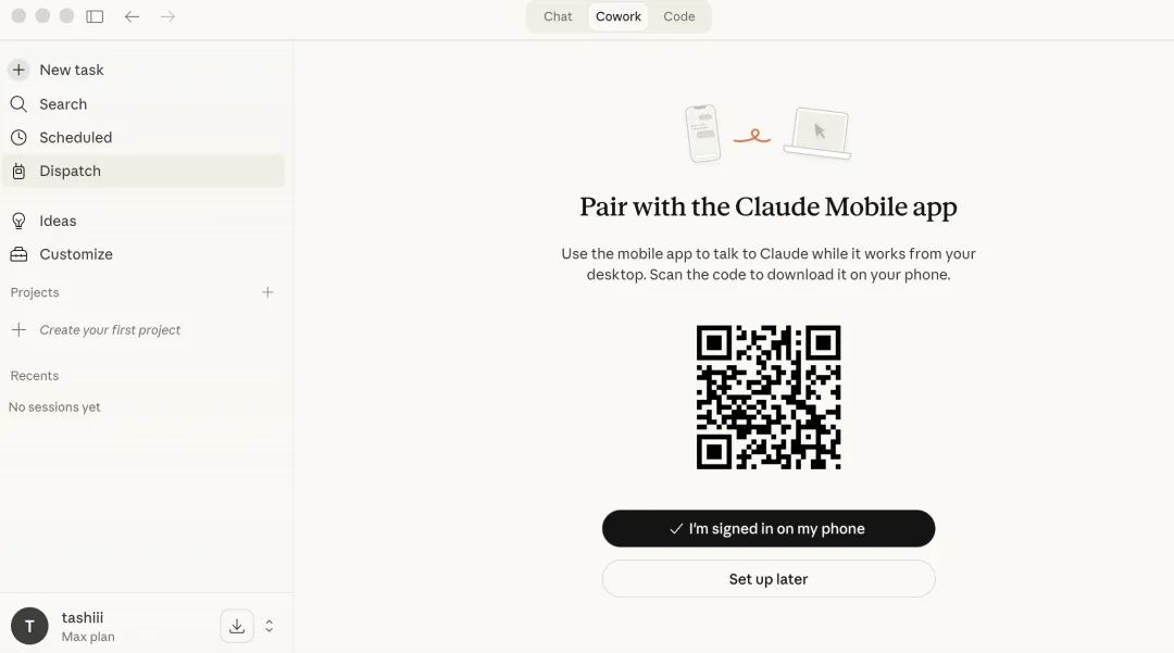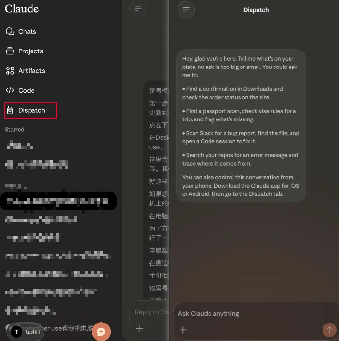 这时候,回到你的手机,打开你的Claude,在里面侧边栏点进Dispatch,就会看到这样的页面。。