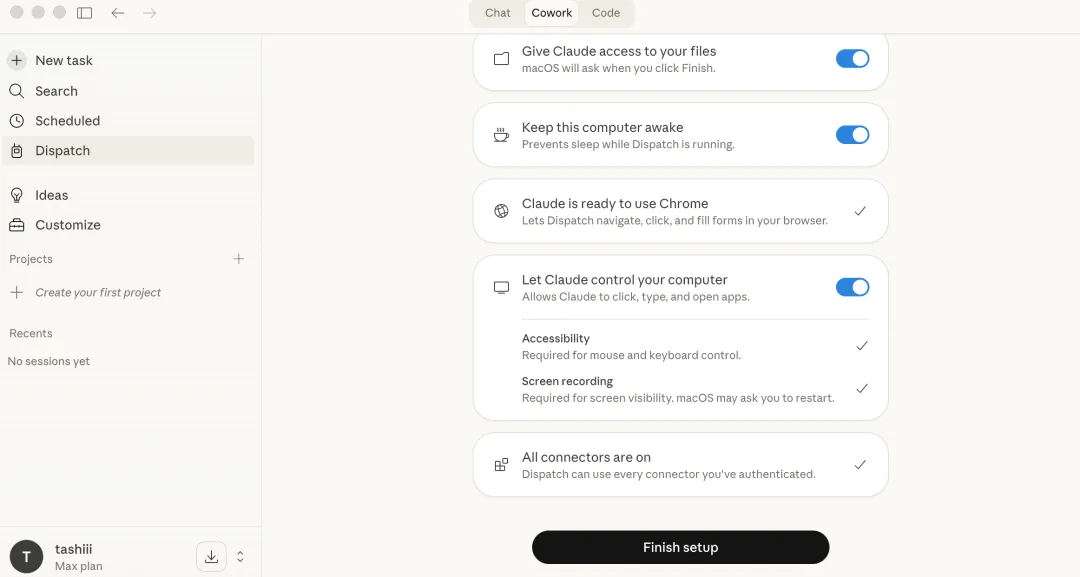 因为这时候,Dispatch会使用Computer Use方案,过程中需要不断截屏,所以Claude会申请录屏和系统录音的权限。