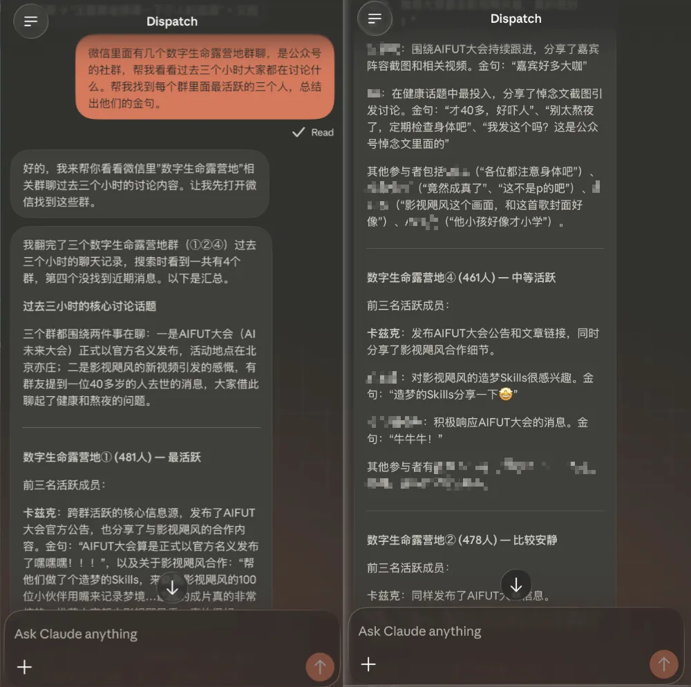 整个过程,Claude真的非常有条理地挨个发消息。