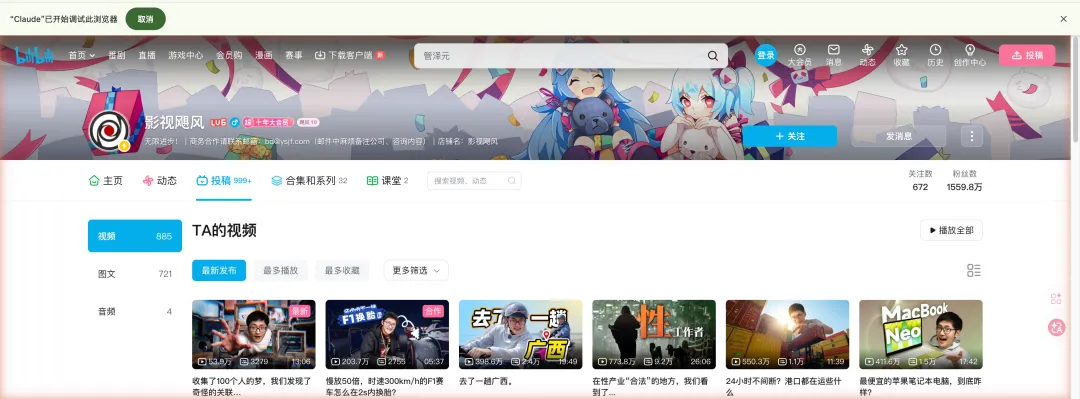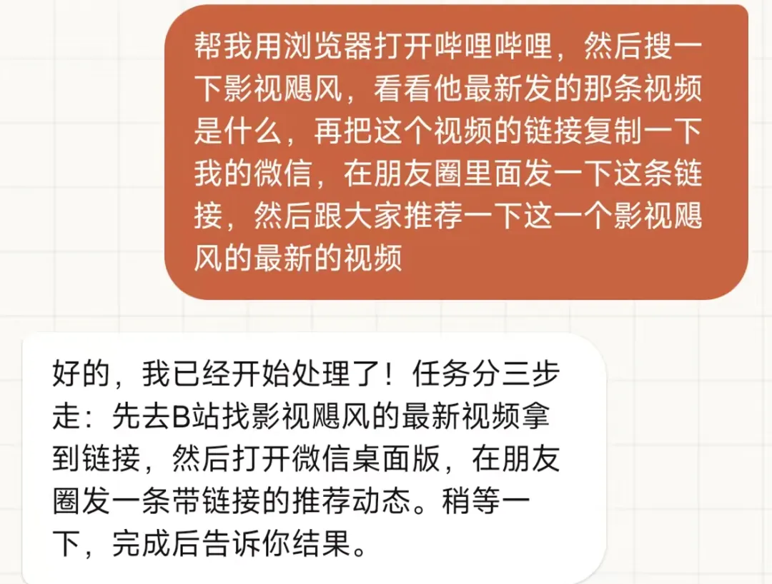 那我就想试一下,能不能用Agent搞个任务,来帮我搜索B站,找到影视飓风新视频的资料,然后发一下朋友圈推荐一下这个视频。