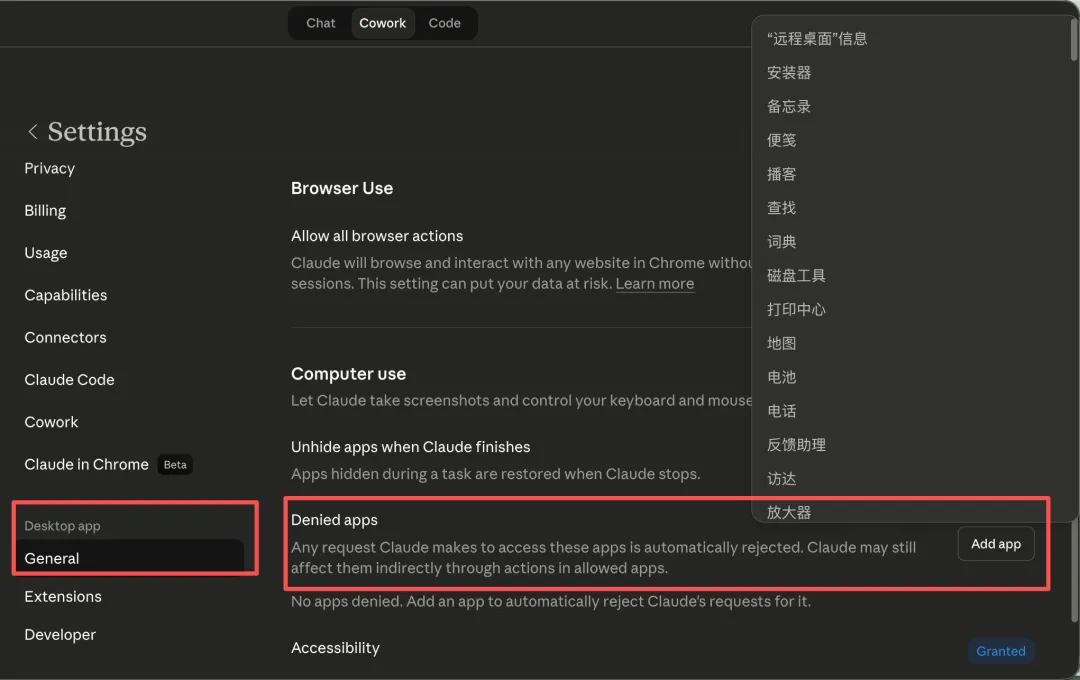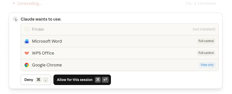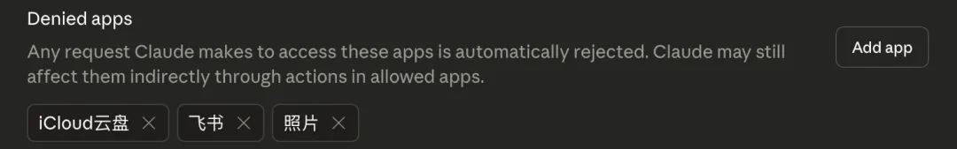 首先是权限管控,Claude每次想访问一个新的应用,都会先问你。