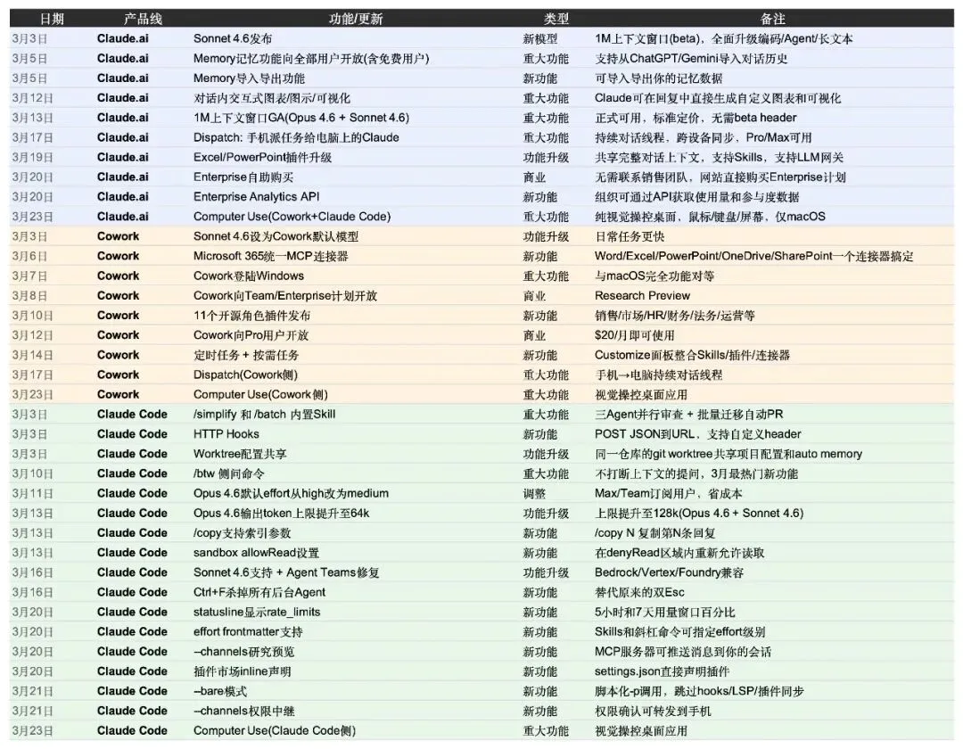 我用Claude随手做了个3月份Claude、Cowork 和 Claude Code的更新情况,然后就给我看懵了。