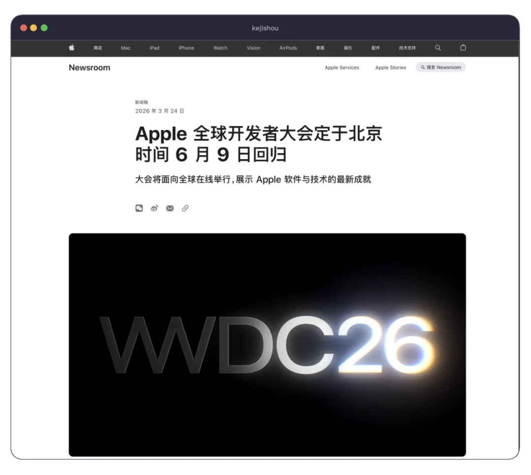 近日,苹果通过新闻稿宣布,WWDC26(Apple 全球开发者大会)将于北京时间 6 月 9 日回归。WWDC 将于北京时间 6 月 9 日(周二)随着主题演讲和 Platforms State of the Union 拉开帷幕。大会将在接下来的一周持续在线举行,包括超过 100 场视频讲座及互动小组实验室和预约活动,开发者可以和 Apple 工程师与设计师直接交流,探索最新发布的内容。WWDC26 将聚焦 Apple 各大平台的精彩更新,包括 AI 进展、新软件与开发者工具。作为公司对开发者持续支持的一部分,WWDC 还将提供与 Apple 工程师和设计师沟通的独家机会,以及对新工具、框架和功能的深度洞察。