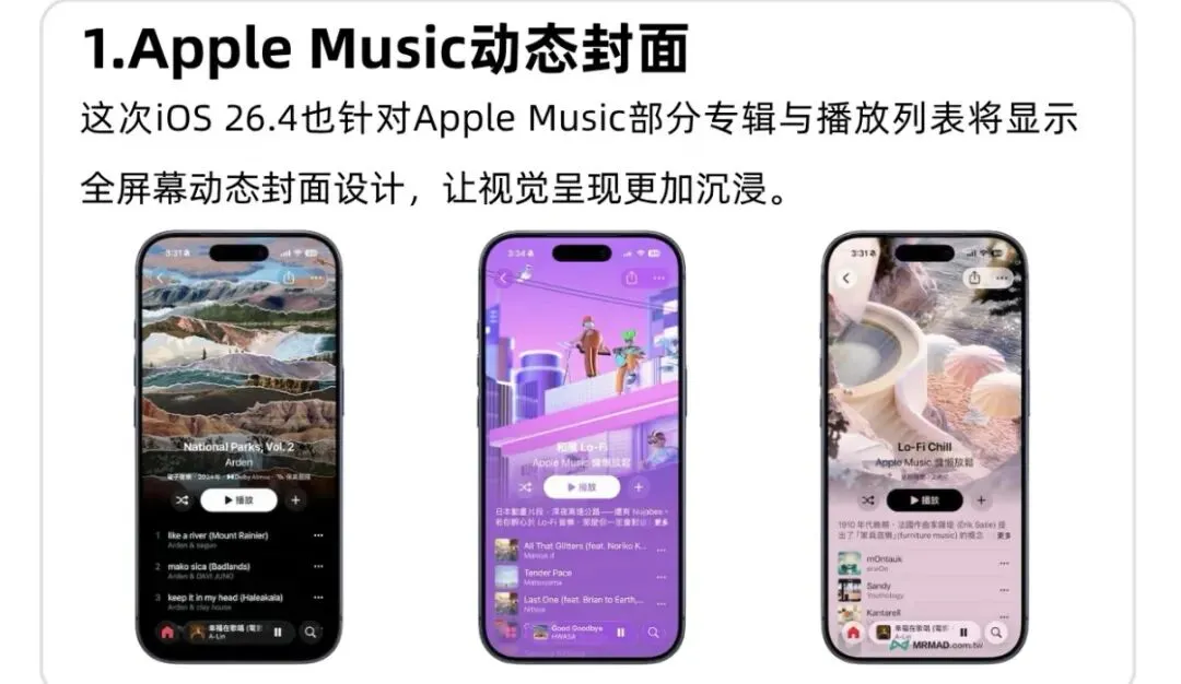 Apple Music实用升级:控制中心新增离线Shazam识曲;专辑/播放页改用全屏背景视觉;新增氛围音乐小组件适配睡眠/专注场景;