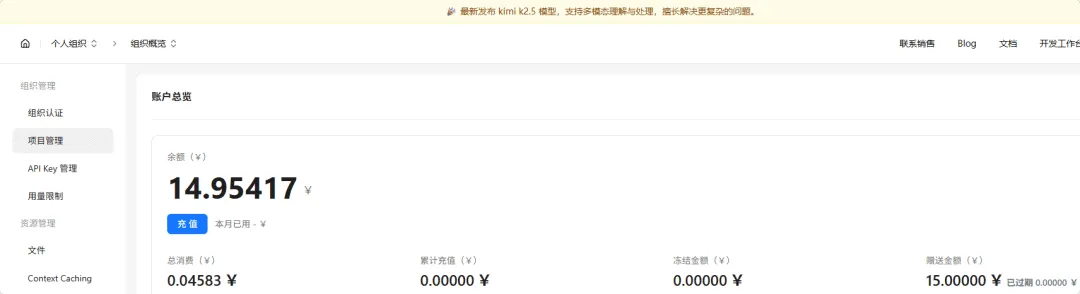 完成个人认证后,可以获得15元的免费额度: