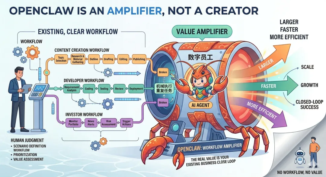OpenClaw 为什么会爆火?真正值钱的不是“养虾”,而是你原本就在做什么OpenClaw 这波最容易被高估的地方,是很多人把它理解成一台会自动创造价值的 AI。实际上,它更像一台放大器。过去几个月,OpenClaw 在开发者社区和中文互联网迅速走红:GitHub 获得极高关注,社交平台上到处都是“养虾”的讨论,云厂商、模型厂商和聊天平台也迅速补齐部署、接入和配套能力。表面上看,这像是一款 AI Agent 产品突然火了;但如果把这波热度拆开看,你会发现,它不是单靠产品本身推动的,而是产品能力、传播符号、产业链跟进和大众情绪一起点燃的。它为什么会火,不只是因为产品本身先说传播。比起一个抽象的 Agent 平台,“养虾”这个说法太具体了:有形象、有人格感、好记,也天然适合在群聊和社交媒体里扩散。AI 一旦被拟人化,讨论门槛会大幅下降。过去 AlphaGo 靠围棋出圈,ChatGPT 靠自然语言对话出圈,OpenClaw 则是靠“数字员工”的想象出圈。它最打动人的,不是更会聊天,而是看起来真的能替你做事。再说产业链。围绕 OpenClaw 这类 AI Agent 场景,模型调用、云部署、远程接入、聊天入口、代装代配等环节都能被带动起来。过去卖 token、卖云、卖部署,更多是基础设施逻辑;现在它们终于有了一个更容易被大众理解的叙事:不是卖算力,而是在卖“数字员工”的可能性。于是,大模型厂商、云平台和聊天工具都愿意快速跟进,这也进一步放大了它的热度。但 OpenClaw 这波真正不一样的地方,不在传播,也不在卖铲子,而在于它第一次让很多普通人直观地看到:AI 不只是待在对话框里,它可能会进入工作流。OpenClaw 真正打中的,是 workflow这里必须把聊天机器人和智能体分开来看。聊天机器人解决的是“回答问题”,智能体尝试接管的是“完成任务”。前者停留在对话层,后者则试图接入工具、执行动作、推进任务链路。也正因为如此,OpenClaw 真正点燃的,不是“AI 更聪明了”,而是“AI 有机会进入 workflow 了”。所谓 workflow,也就是一条清晰的任务链路:有明确输入、稳定步骤、可验证输出和持续反馈。开发者有 workflow——提需求、写代码、测试、提交、审核;自媒体有 workflow——选题、搜集素材、起标题、出稿、发布;投资人有 workflow——监控持仓、筛新闻、做预警、触发提醒;客服团队也有 workflow——接收问题、匹配知识库、回复、标记客户、升级处理。一旦有了这样的链路,智能体的价值就出来了。它可以接一部分活,缩短一部分时间,自动化一部分重复动作,连接原本断开的环节。换句话说,OpenClaw 真正值钱的,不是“有一个智能体”,而是它能不能接进一条已经存在的 workflow。为什么很多人“养虾”最后只是表演反过来,没有 workflow 的人,往往最容易高估它。很多人说自己想要一个智能体,真正想要的却是“你自己去帮我赚点钱”“你自己去做个会火的账号”“你自己去搞个生意”。这些是结果,不是 workflow。没有任务链路,智能体再强,也只能在空中打转。这也是为什么,真正把 OpenClaw 用出价值的人,通常并不是最焦虑的那批人,而是本来就有业务闭环的人。开发者、自媒体、投资人、小老板,或者任何已经拥有稳定工作流的人,更容易从中获得真实收益。因为对他们来说,OpenClaw 不是许愿机,而是一只能够插进既有流程里的手。所以,工具不会替你创造业务。工具只会放大你原本就在做的事情。准确一点说,智能体的价值大概等于:智能体价值 = 模型能力 × workflow 清晰度 × 人的判断质量模型能力再强,如果 workflow 是虚的,结果就虚;workflow 再清晰,如果人的判断不行,智能体也可能一路跑偏。那些“AI 自动创业”“AI 自己赚钱”的传奇案例,更适合被看作市场对智能体能力的想象被迅速放大,而不是一个普通人可以轻易复制的现实模板。对产品经理和普通人,真正的启发是什么从这个角度再看,OpenClaw 这波最值得思考的,不是“要不要养虾”,而是你手里有没有值得被放大的东西。这件事对产品经理尤其有启发。AI 越强,人越不该待在低价值 loop 里。查文档、手动部署、信息搬运、重复执行,这些都应该尽快交出去。人真正值钱的位置,不在机械执行,而在 workflow 的上游和中枢:靠近用户、理解场景、定义问题、做优先级判断、连接用户心理模型和系统实现逻辑。智能体可以接执行,但很难替你完成场景判断;它可以压缩链路,但不能替你决定什么链路值得存在。所以,OpenClaw 爆火,表面上是一场 AI Agent 狂欢,底层其实是在提醒所有人一件更现实的事:未来真正被拉开差距的,不是谁先跟风装上了一个智能体,而是谁先把 AI 接进了真实业务、真实流程和真实任务链路里。结语OpenClaw 不会凭空替你创造一个生意,但它很可能把你原本就在做的事放大很多倍。问题从来不是要不要养虾,而是你原本就在做什么,它是不是一条清晰的 workflow,以及它值不值得被放大。