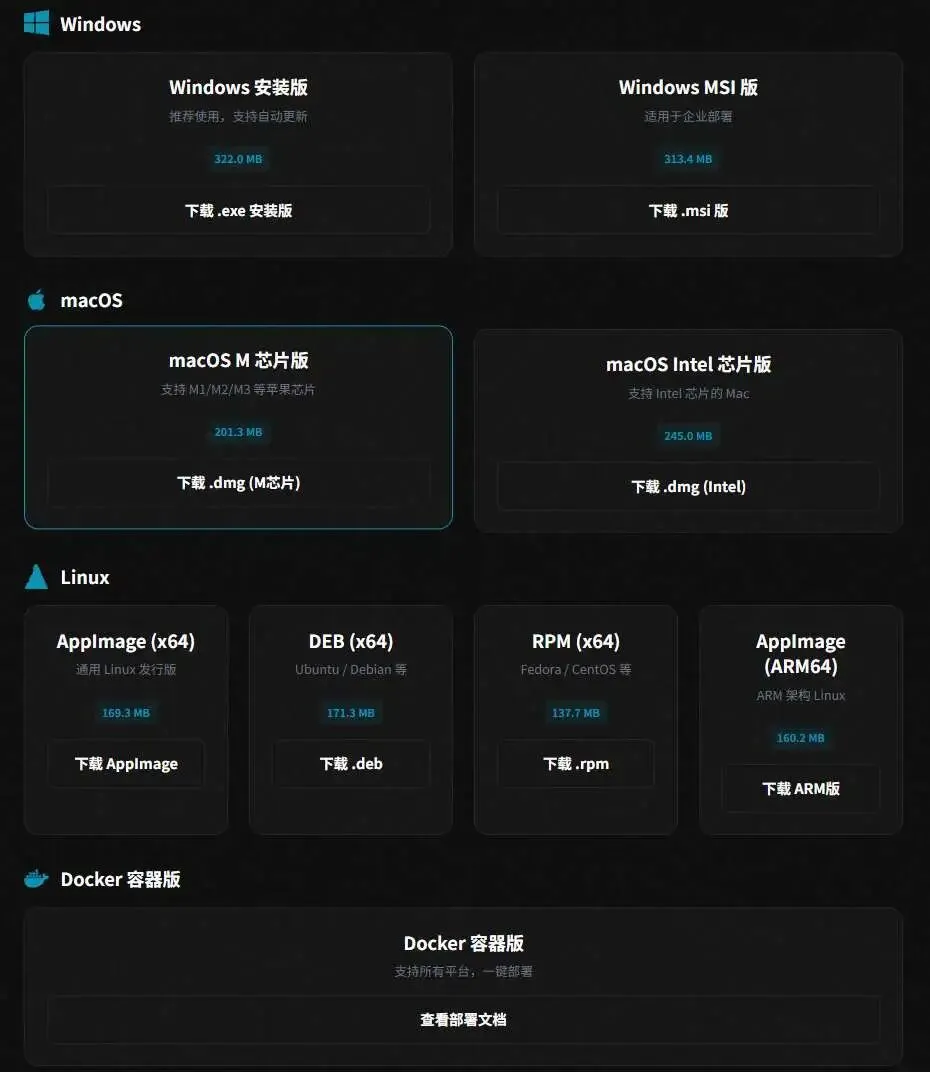 它还提供了多版本选择,不用太担心电脑系统不适配,也有 Docker 容器版本。