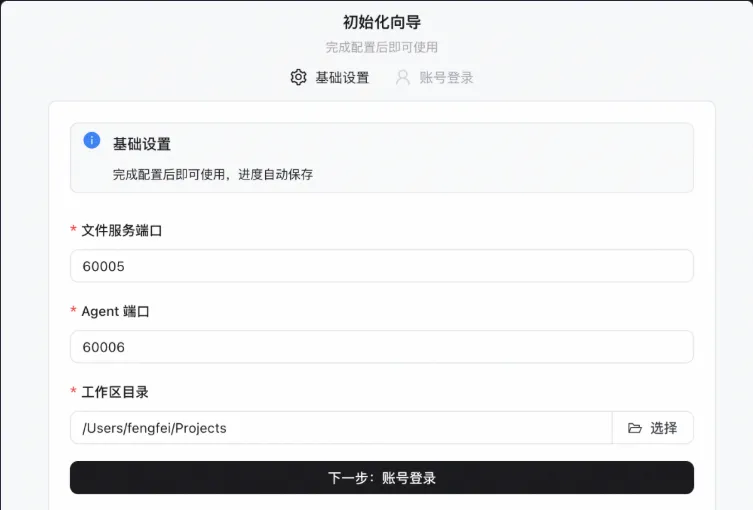 运行安装初始化后,输入服务域名地址(可选,私有化部署时填写)、用户名(手机号或邮箱)以及 6 位动态认证码,就可以完成配置。