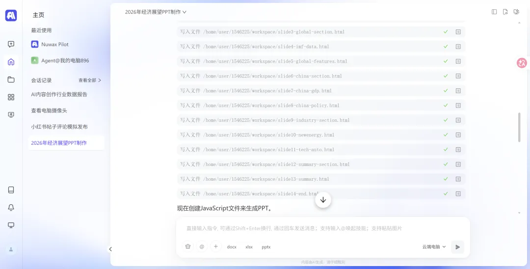 比如我这里做一个 PPT,只需要在聊天框里用自然语言输入需求即可。