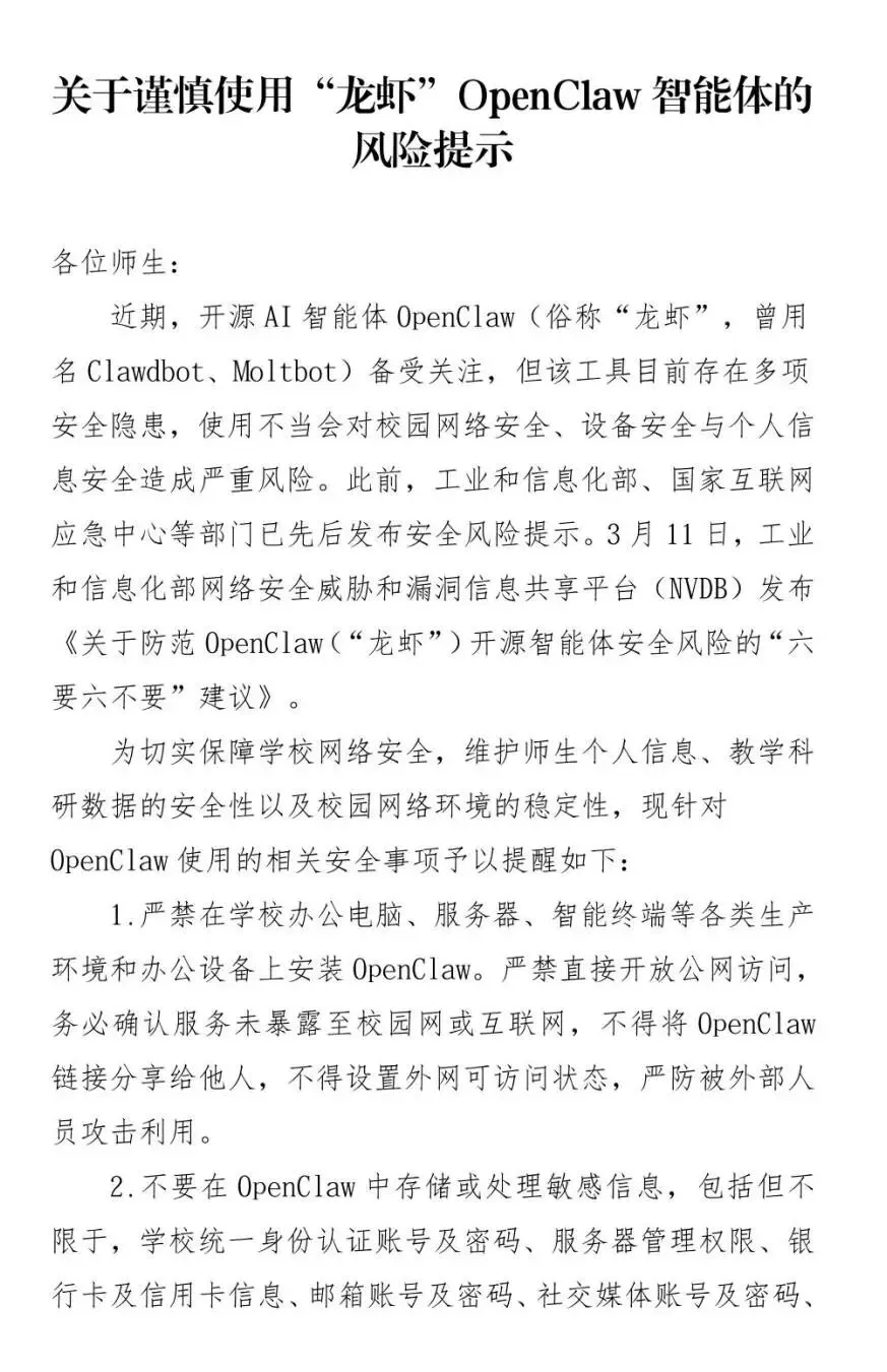 关于谨慎使用"龙虾"OpenClaw智能体的风险提示