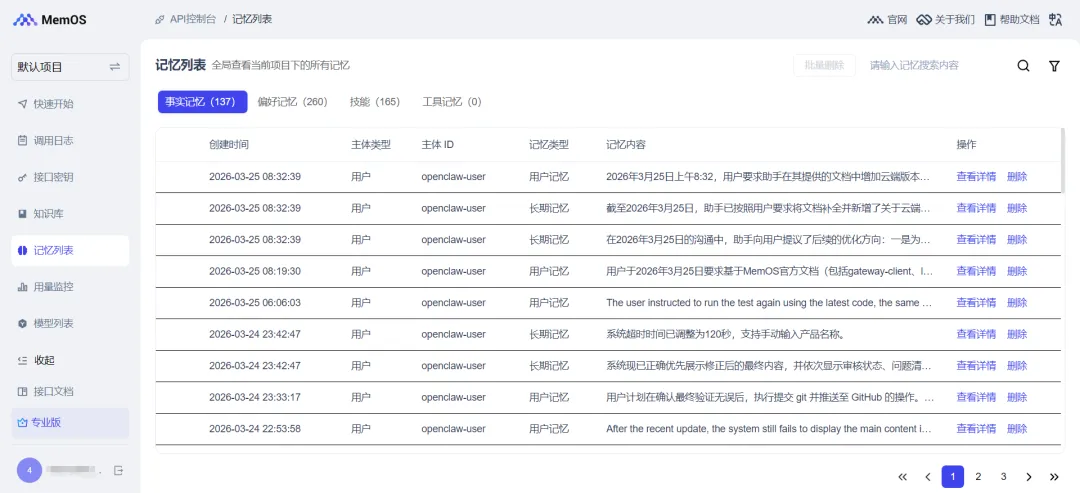 如果配置正确,它就会开始调用云端记忆来回答。访问https://memos-dashboard.openmem.net/cn/memoryList,可以查看记忆记录,它还贴心地帮你进行分类:事实记忆、偏好记忆、技能、工具记忆。