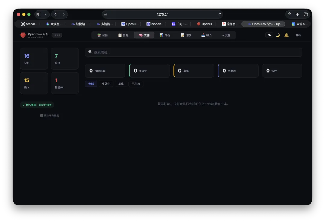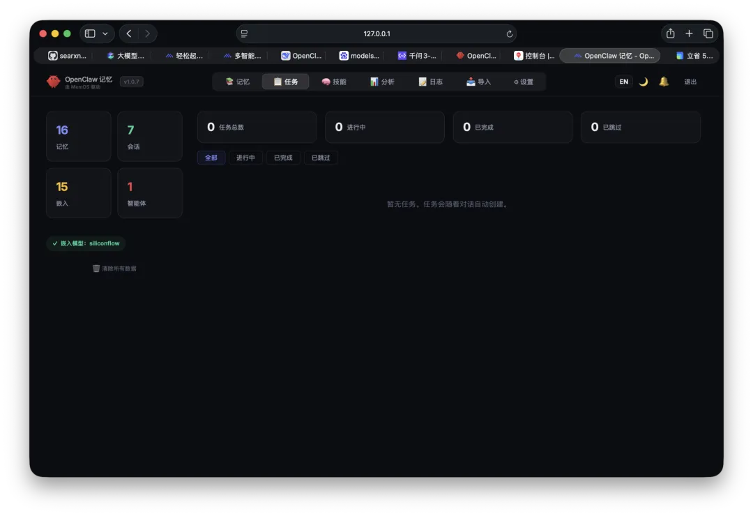你可以在这里查看记忆、任务、技能和设置。