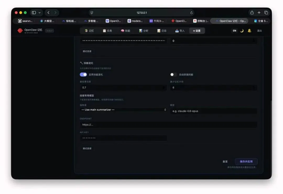 如果你希望 MemOS 自动把任务经验沉淀成技能,还可以给 skill summarizer 单独配一个更高质量的模型,配置路径:设置>AI模型,最低部找到“技能进化”。