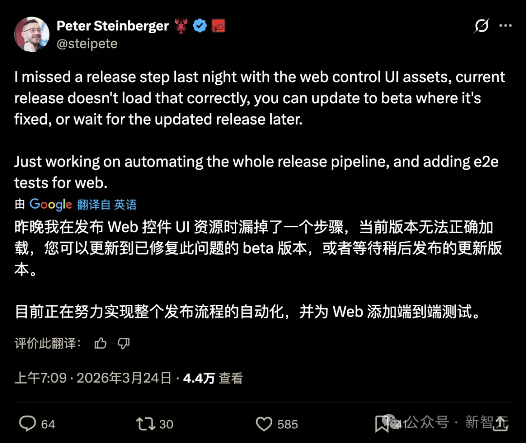 OpenClaw 之父 Peter Steinberger,在昨天发布 OpenClaw 3.22 版本时,漏掉了发布流程里的一个关键步骤:把 Web 控制台的 UI 资源打包进去。