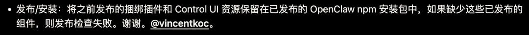 官方 3.23 的修复日志里,有一条写着:确保已发布的 npm 包里包含之前版本携带的 bundled 插件和 Control UI 资源,并在发布检查时,若这些产物缺失则直接让流程报错。
