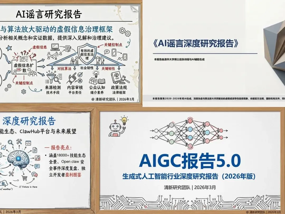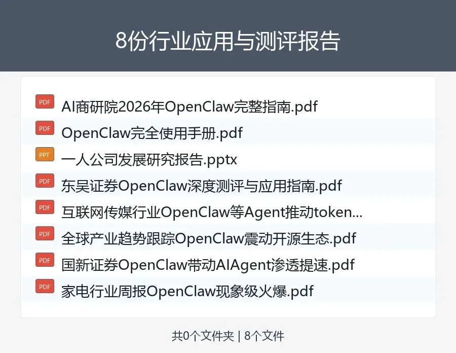 发展研究:OpenClaw发展1.0/2.0、AIGC研究、AI谣言研究等核心报告 行业应用:券商深度测评、行业周报、使用手册等实践资料 机构研报:东吴证券、国新证券等专业机构分析报告 趋势洞察:全球产业趋势、AI Agent渗透提速等前沿内容 学习参考:完整指南、白皮书、研究报告等系统资料