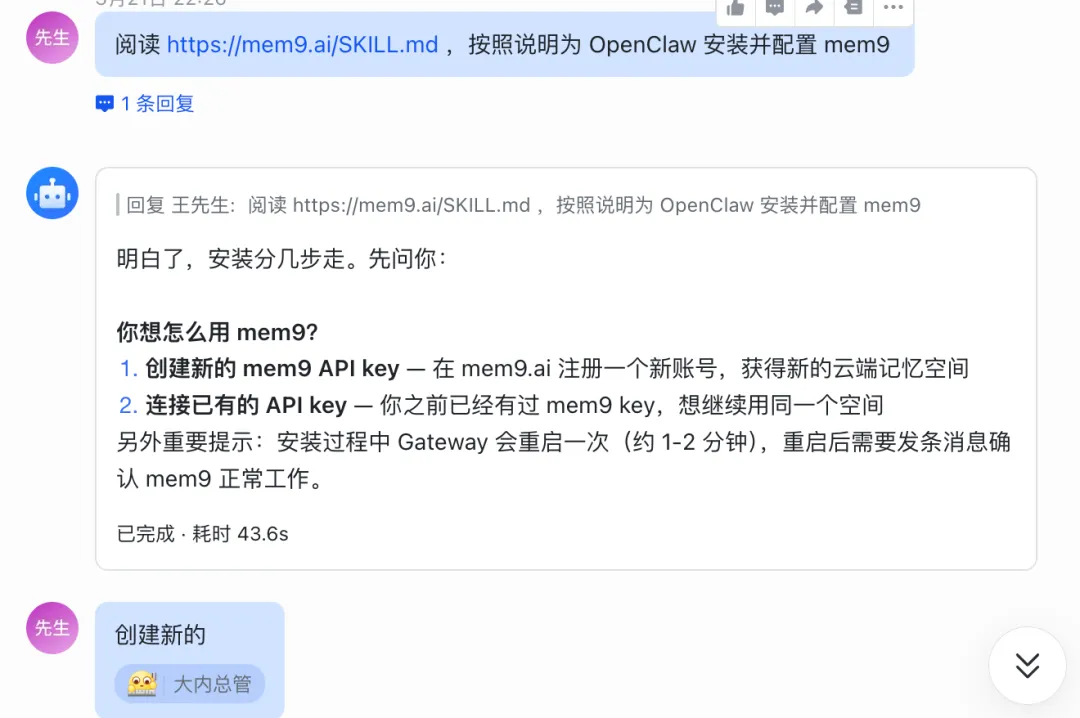 Mem9的官网(mem9.ai),配合OpenClaw使用非常方便。安装流程也很简单,直接龙虾对话: