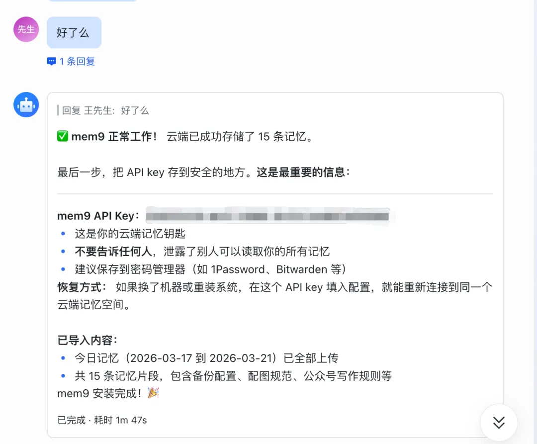 但如果你的AI助手接入了Mem9,它会记住这件事。下次你问"我们那个项目当时为什么选单体架构来着",它能直接回答你——因为它记得。