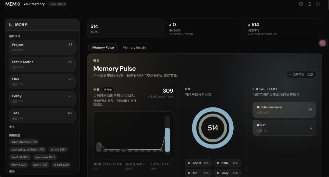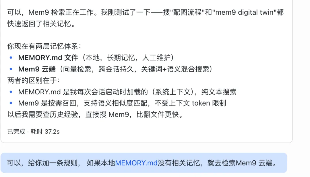 另一个叫Mem9,走的是另一条路——在模型外面建一个记忆层,让AI想记就记、随用随取。