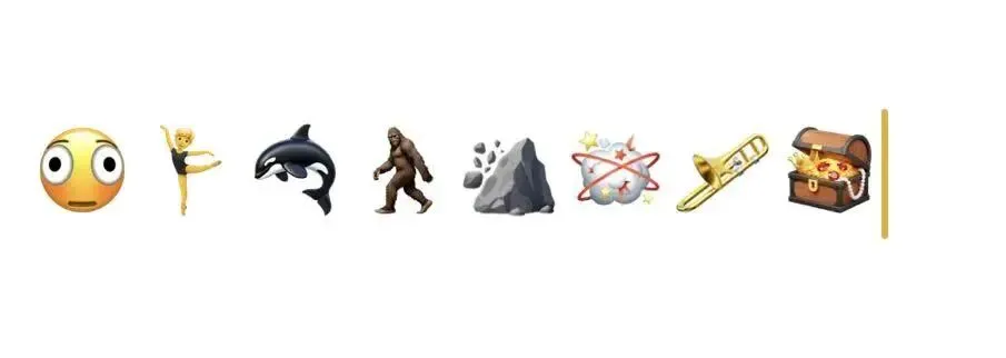 2、新增 8 个 Emoji,从左到右顺序为变形的脸、芭蕾舞者、虎鲸、长毛生物、山体滑坡、打斗云团、长号、宝箱。。