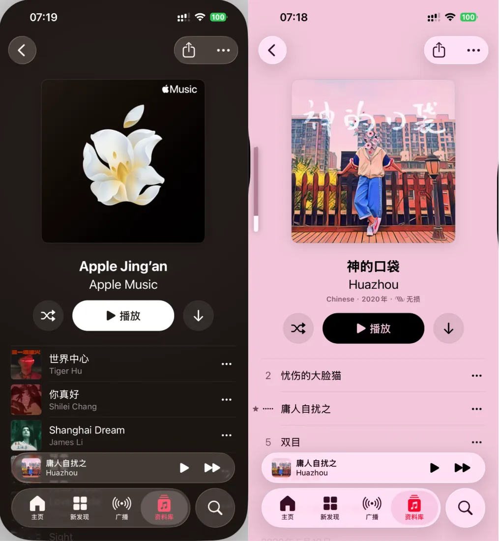 3、新增了 Apple Music 现在会为播放列表和专辑自动匹配封面相近颜色的背景。